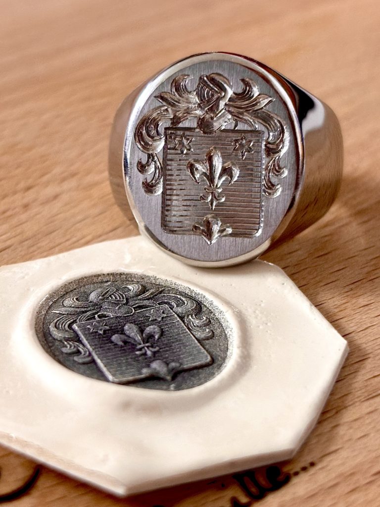 Ensuite, le travail de précision commence par un traçage millimétré sur le plateau de la bague. Grâce à cette base rigoureuse, le graveur peut alors sculpter la matière sous binoculaire à l’aide de burins et d’échoppes artisanales. Ce geste séculaire permet de chercher une profondeur et une netteté que seule la main de l’homme sait obtenir. De cette manière, chaque relief et chaque ombre du blason prennent vie directement dans le métal précieux.