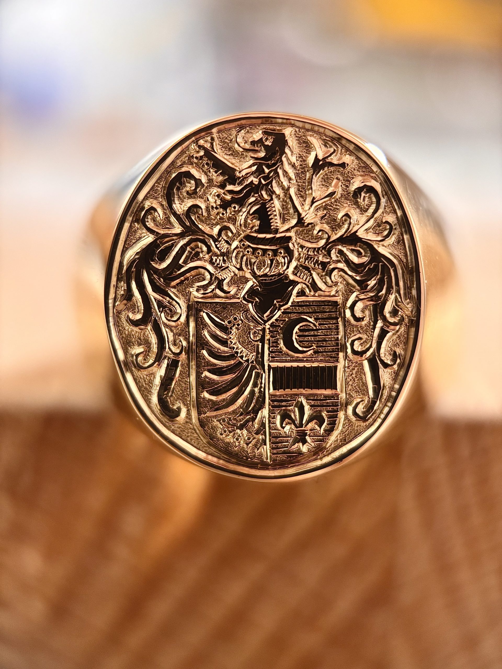 Le choix d’un or 18 carats permet une précision de gravure exceptionnelle, quelle que soit la forme de plateau de chevalière que vous aurez choisie.